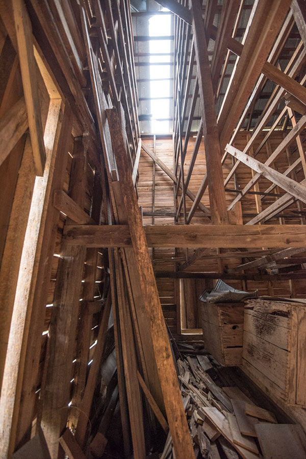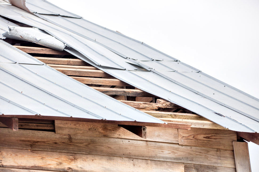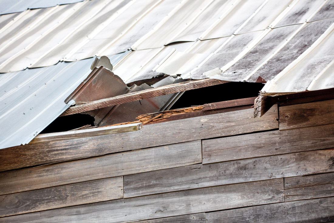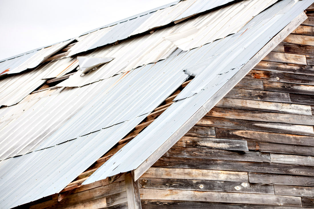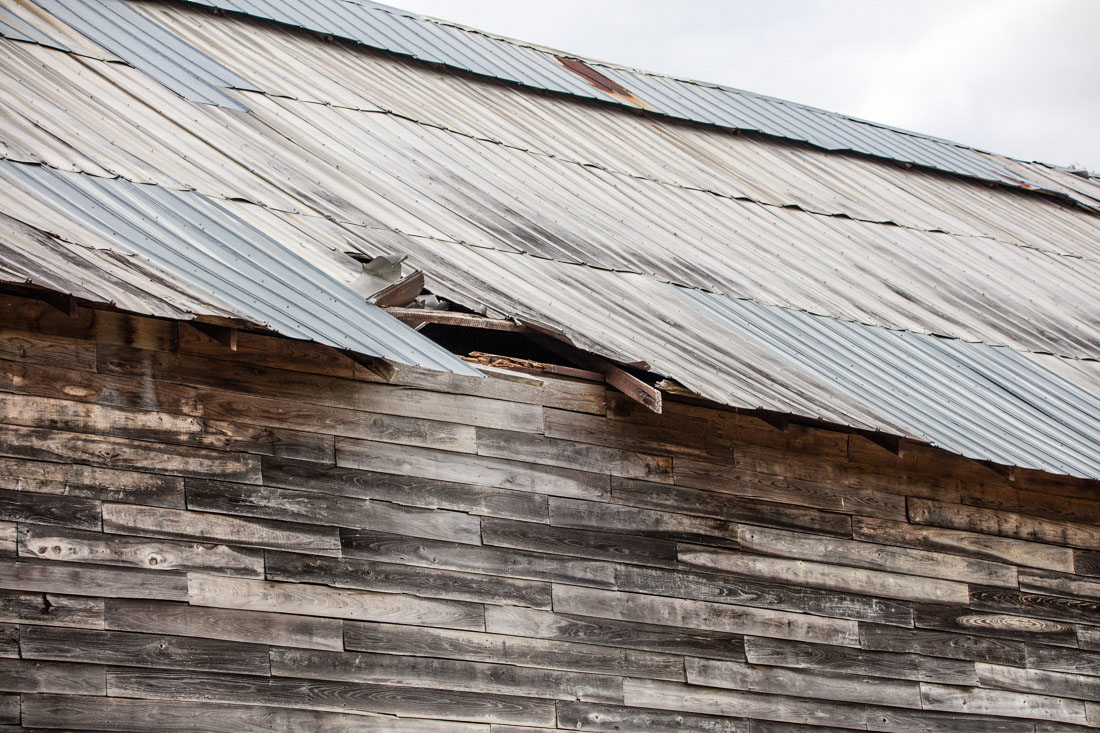 The barn is in need of roof repair. Wood replacement is